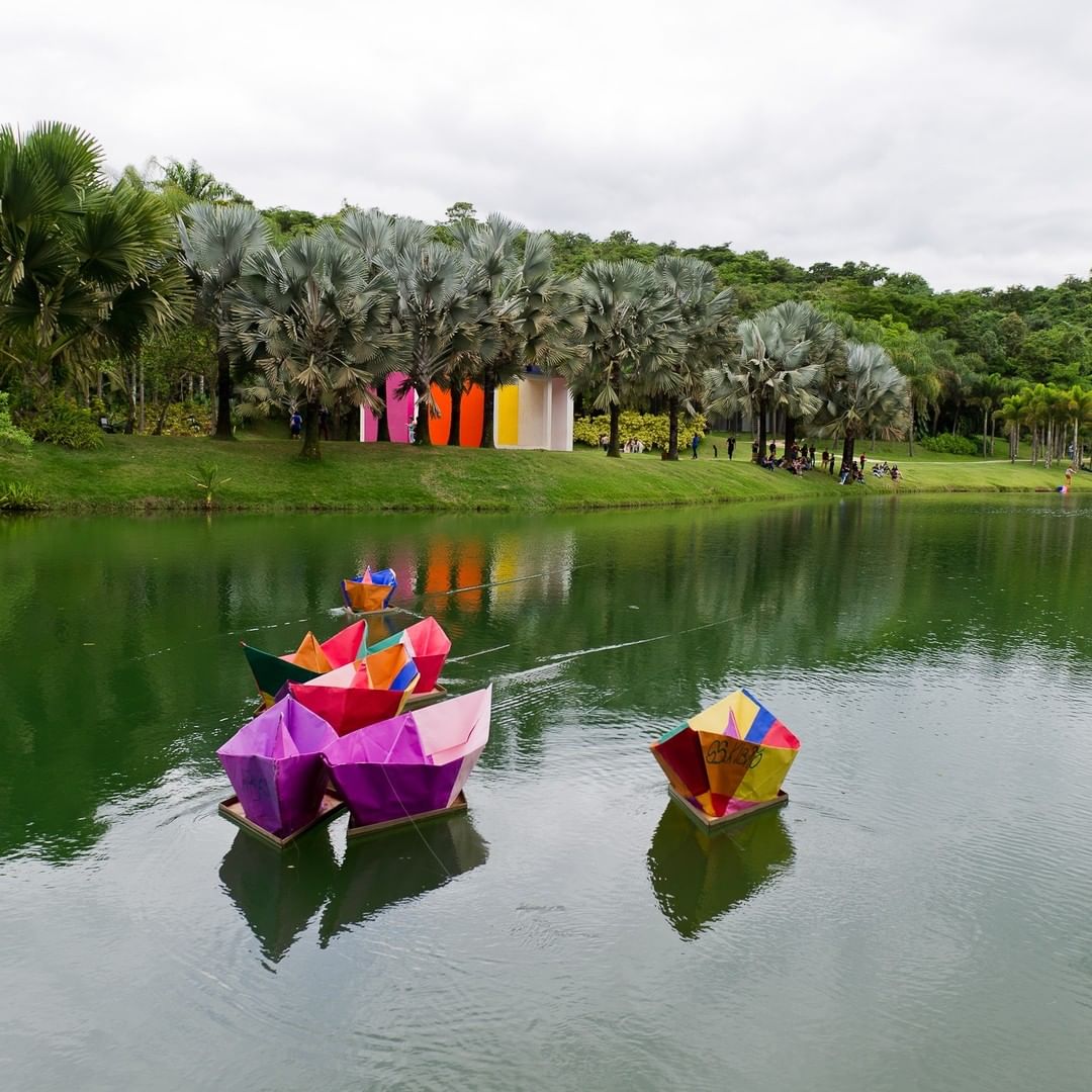 Sua localização privilegiada – entre os ricos biomas da Mata Atlântica e do Cerrado –, e as paisagens exuberantes ao longo dos 140 hectares de visitação proporcionam aos visitantes uma experiência única que mescla arte e natureza. Cerca de 1.862 obras de mais de 280 artistas, de 43 países, compõem o acervo e são exibidas ao ar livre e em galerias em meio a um Jardim Botânico com mais de 4,3 mil espécies botânicas raras, vindas de todos os continentes.